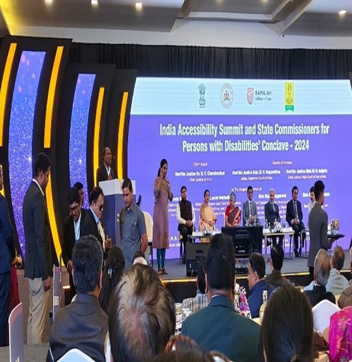 India Accessibility Summit and State Commissioner for Persons with Disabilities Conclave 2024Persons with Disabilities Conclave 2024 On July 27th, 2024, Sister Madhuja attended the India Accessibility Summit and State Commissioners for Persons with Disabilities' Conclave 2024. The event began at 10:30 AM with a symbolic lighting of the lamp by distinguished dignitaries. The Chief Justice of India, Honorable Shri Justice D Y Chandrachud, served as the chief guest. Other notable attendees included Honorable Smt. Justice B.V. Nagarathna, Sri Rajesh Agarwal (IAS Chief Commissioner for Persons with Disabilities Act and Secretary, Department of Empowerment of Persons with Disabilities, Government of India, New Delhi), Hon'ble Shri N V Anjaria (Chief Justice of the High Court of Karnataka), and Smt. Shalini Rajinish (IAS). Students from Shradhanjali Integrated School and Ramaiah College of Law, Bengaluru, delivered heart-warming performances. The summit featured thought-provoking panel discussions on legal accessibility for persons with disabilities, inclusive educational and professional environments, and accessible transportation. The program concluded at 6:30 PM, leaving attendees inspired to drive change towards a more inclusive society.